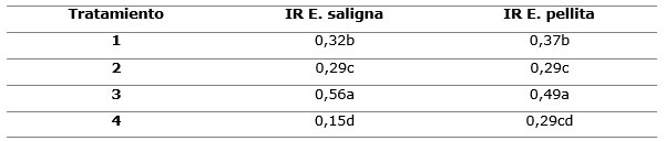 Estos datos fueron procesados con las facilidades del sistema Microsoft Excel donde se determinaron las medias de cada uno de los parámetros cuantificados, así como el IRT, según el tratamiento y la especie, utilizando la metodología descrita por Beltrame et al. (2015), ( Ecuación 3).
