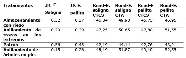 Con la prueba HSD Tukey se comprobó que existen diferencias significativas entre los métodos aplicados, donde el T4 (anillado de árboles en pie) es el de mejor comportamiento con el menor índice de rajadura, aunque en los demás métodos aplicados se aprecia una tendencia al decrecimiento del mismo con relación al patrón, ( Tabla 1), coincidiendo con Beltrame et al. (2015).
