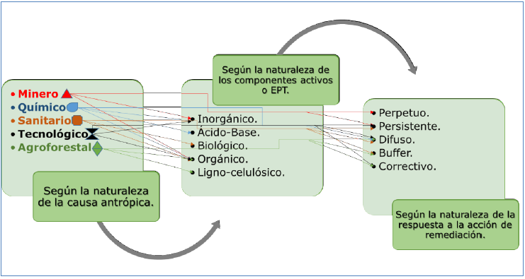 Esta clasificación de pasivo ambiental que se representa en la figura 1, considera todo tipo de actividad, que afecta el estado ambiental previo. Correlaciona la proporción directa entre la explotación de los bienes naturales disponibles y la emisión de residuos en su entorno inmediato, próximo o indirecto. Establece premisas claves, sobre la perdurabilidad de las modificaciones a las condiciones naturales previas y la continuidad o persistencia de los efectos negativos del pasivo ambiental.