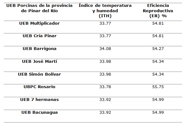 El análisis de la ER, a través del RBC que se obtuvo se muestra en la Tabla 1, destacándose que el índice de Temperatura y Humedad Relativa (ITH) y la Eficiencia Reproductiva (ER), en las UEB Porcinas de la provincia de Pinar del Río, es desfavorable, debido al comportamiento climático para el periodo de análisis, que se comportó, muy lluvioso y cálido, lo que motivó tal situación.