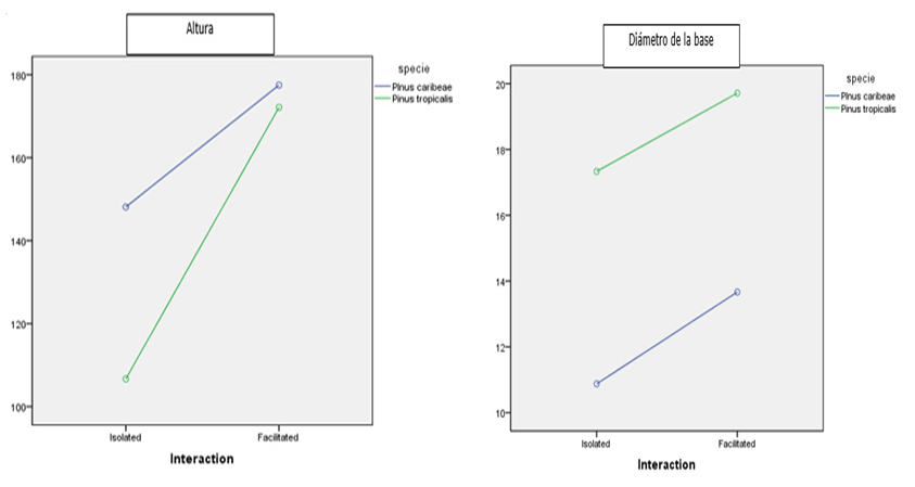Los resultados (Figura 7) muestran una diferencia significativa entre las dos mediciones realizadas a lo largo de un año, para las variables altura y diámetro de la base en 20 individuos de ambas especies ( P. tropicalis y P. caribaea). Las representaciones gráficas de los valores medios marginales de altura y diámetro en ambos momentos muestran el incremento significativo de los individuos de estas dos especies bajo plantas nodrizas con respecto a los registrados en espacios abiertos.