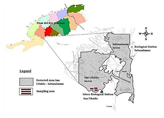 El estudio se realizó, en el Sector Santa Teresa de la Reserva Florística Manejada San Ubaldo- Sabanalamar, Pinar del Río, Cuba (Figura 1), se trazan seis transectos paralelos de 100 m cada uno siguiendo los criterios de (Oviedo et al., 2014). La estimación de la cobertura vegetal y el registro de toda la vegetación se realizó utilizando el método de línea transepta (Canfield, 1941).