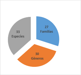 Fueron registrados 1206 individuos, pertenecientes a 33 especies, de 30 géneros y 27 familias (Figura 2). El 75 % de los individuos viven espacialmente agregados con otras especies, formando un total de 17 parches multiespecies. Por otro lado, (25 %) vive en los 15 espacios abiertos registrados (Figura3). Al analizar la proporcionalidad entre las categorías taxonómicas, en la evaluación de la estructura filogenética realizada, se determina que no existe una estructura anidada, como se observa en otras comunidades con un entorno menos extremo dominado por el proceso de competencia, según (Pausas & Verdú, 2010).
