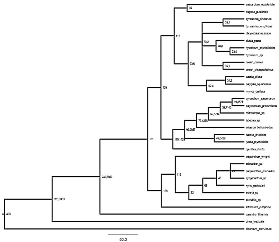 Se creó un árbol filogenético (Figura 6) con especies de plantas registradas en la comunidad para comparar las distancias filogenéticas entre ellas, y así verificar si prevalecía la competencia o la facilitación, como en (Oviedo et al., 2014) se muestra una alta filodiversidad con una raíz de árbol bien datada de 400 millones de años.