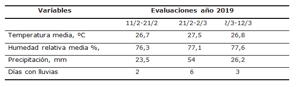 El estudio se realizó en dos fincas de las Cooperativas de producción y servicios (CPA) del municipio Pinar del Río; Roberto Amaran y Fructuoso Rodríguez durante un año a intervalos de 15 días en el período de enero a marzo del 2019. Durante el año el promedio de las variables climáticas osciló de la siguiente manera: humedad relativa de 78.2 %, precipitación de 1,462 mm, temperatura máxima 26,5 °C , temperatura mínima de 22,4 °C y los vientos de 14,4 km/h sobre el nivel del mar 61,00 m. En la Tabla 1 se muestran los datos climáticos que prevalecieron durante el proceso de recolección de las hojas de la especie Cordia collococca.