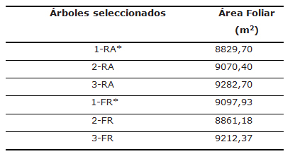 La similitud de los resultados del área foliar (m 2) permitió la selección de los árboles para la investigación ( Tabla 3).
