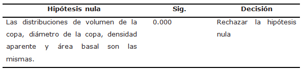Aunque visualmente se observó que los árboles de la muestra son semejantes entre sí, la prueba estadística de hipótesis nula confirmó que no todas las medidas de las muestras de árboles seleccionados son iguales ( Tabla 4).