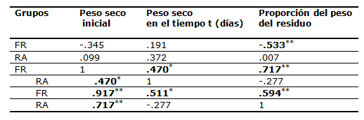 Se apreciaron interrelaciones significativas, expresándose el valor cuantitativo de cada una de las variables, sin embargo, al aplicar la correlación de Pearson entre el porcentaje de peso de la materia seca remanente de hojas de árboles de la especie C. collococca y las variables peso seco inicial y peso seco en el tiempo t (días), se evidenció una dependencia negativa en la primera recolección para ambos agroecosistemas, siendo estadísticamente significativa (P<0,01) para el agroecosistema Fructuoso Rodríguez, mientras que para la segunda recolección existe una correlación positiva estadísticamente (P<0,01).