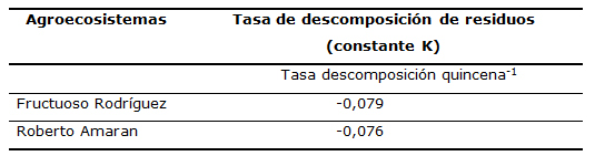 La tasa de descomposición (constante K) durante el tiempo evaluado fue diferente en los agroecosistemas de estudios, la variación más significativa fue en el período del 10 de febrero al 24 de febrero con un tiempo requerido para la descomposición de la fracción foliar entre 35 y 65 %.