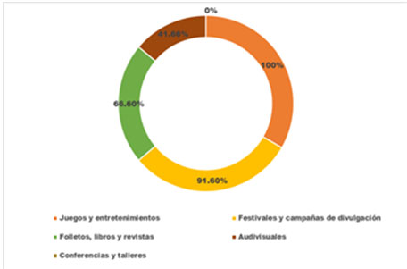 Con respecto a las formas en que le gustaría recibir información y conocimientos sobre la diversidad biológica del área la encuesta aplicada a niños y niñas de la comunidad arrojó que el 100 % prefiere la utilización de materiales con juegos y entretenimientos, el 91.6 % apoyó la realización de festivales y campañas de divulgación, el 66.6 % planteó a través de folletos y revistas y solamente 41.66 % de los encuestados surgieren la proyección de audiovisuales (Figura 2).