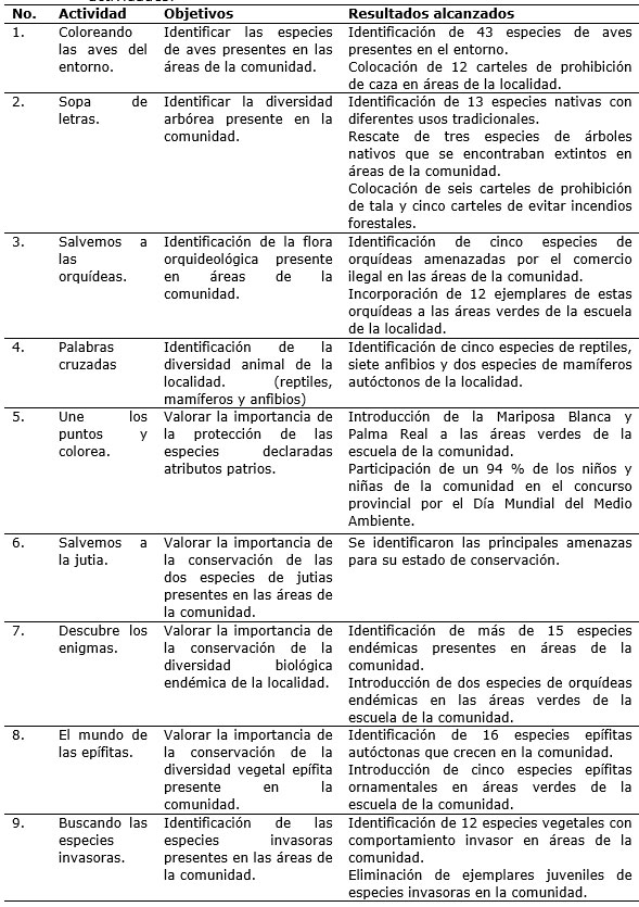 La implementación del sistema de actividades ha posibilitado el incremento de la participación de los niños y niñas de la comunidad en actividades relacionadas con la temática de la conservación del medio ambiente, además se logró la introducción de seis especies autóctonas (ornamentales, maderables, medicinales y frutales) en áreas de la localidad, la eliminación de ejemplares juveniles de especies invasoras y la creación de la Patrulla Pioneril Comunitaria de Inspección Ambiental, se ha incrementado.