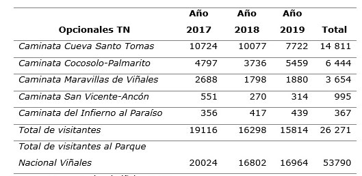 Entre los años 2017 al 2019 visitaron las áreas del Parque Nacional Viñales un total de 53 790 visitantes de los cuales el 95% asistieron al menos a una de las cinco opcionales de turismo de naturaleza que administra el área protegida, según datos estadístico oficiales del Parque Nacional Viñales que apuntan además que en esos mismos años, que las opcionales más visitadas fueron las caminatas Cueva Santo Tomas y Cocosolo-Palmarito, seguido por Maravillas de Viñales, y las caminatas San Vicente Ancón y del Infierno al Paraíso, tal como se observan en la siguiente Tabla 1.
