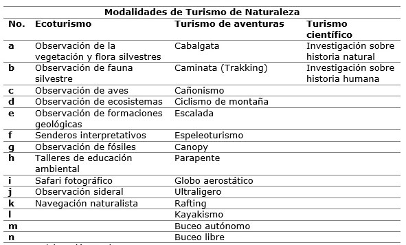“Modalidad Turística Genérica conformada por modalidades específicas, cuya principal motivación es el estudio y admiración de los valores naturales y componentes culturales asociados, así como la realización de actividades recreativas, físicas y de riesgo que utilicen el medio natural, conservado o manejado responsablemente, donde se garantiza la seguridad del turista, sin degradar o agotar los recursos, en beneficio de la naturaleza y las comunidades locales” (p. 7).