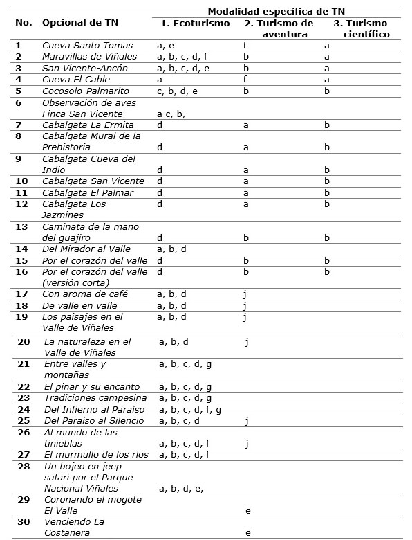 Tomando en cuenta las actividades que pueden desarrollarse en cada una de las modalidades de turismo de naturaleza y según su clasificación taxonómica de Ramírez y Pérez (2014) se evaluaron los atractivos de las principales ofertas en el Parque Nacional Viñales, correspondiendo los mayores atractivos a la Cueva Santo Tomás, el sendero Maravillas de Viñales, los recorridos San Vicente al Valle Ancón, Cocosolo al Valle del Palmarito y del Infierno al Paraíso (Tabla 2 y Tabla 3).