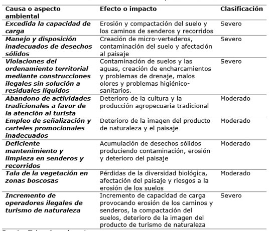 Basado en los criterios anteriores se elaboró una matriz (Tabla 3) que ofrece una relación causa-efecto con la valoración o clasificación de los impactos negativos de mayor importancia y por consecuencia susceptibles de incorporar en los planes operativos y de manejo del área protegida y de los operadores del turismo.