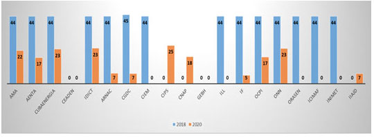 A través de Keyhole, se determinó el porcentaje de usuarios que reaccionaron, compartieron, dieron click o comentaron una publicación en cada una de las páginas, o sea, que interactúan con los contenidos respecto al total de seguidores. Este indicador conocido como por ciento de participación o compromiso con los seguidores, obtiene en los dos períodos niveles deficientes de participación (entre 21 % y el 40 %) para cinco ECTI, y nulo (de 0 al 20 %) para 14 entidades (Figura 3)