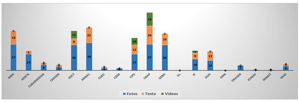 La utilización de los recursos se realizó a partir de un máximo de 99 en cada período y se determinó el promedio de ambos, a partir de los resultados obtenidos con la herramienta Keyhole (Figura 2), donde el recurso más utilizado para intercambiar información en las ECTI, son las fotos en un 61 %, seguido por los textos en un 30 %. En ambos períodos es muy deficiente el uso de link, por todas las ECTI, y las que mejores resultados alcanzaron en el total de utilización de los recursos fueron el CNAP, ARNAC y AMA.