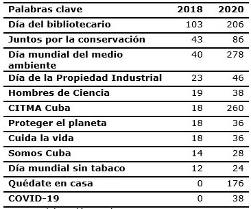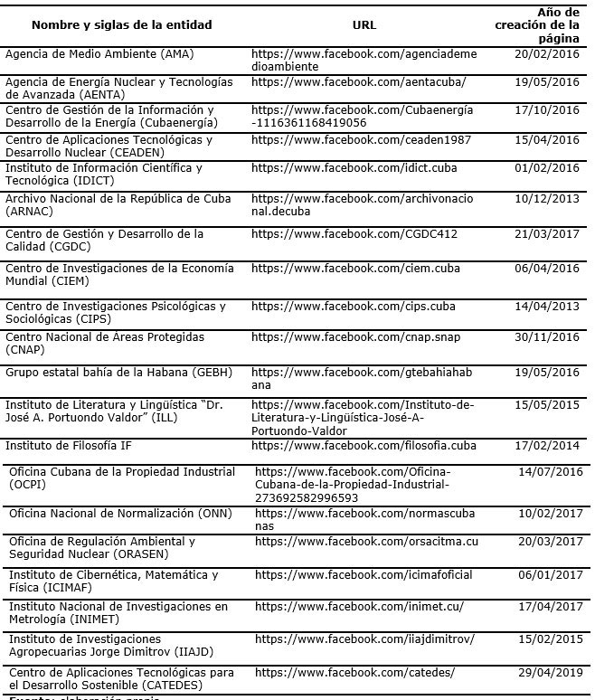 Abstract: Organizations dedicated to science, technology and innovation use social networks as a way to share the knowledge they generate, which allows their exchange with the scientific community and society. From this perspective, and from the review of some antecedents on the subject, the investigation analyzed the use of the social network Facebook of 20 Science, Technology and Innovation Entities, in Cuba from February 2018 to May 2020, based on social media analytics indicators such as: page presentation, performance, number of followers, responsiveness, use of resources, participation and interaction, use of keywords, and extension of publications. It was obtained as a result that the use of Facebook has been accepted by the entities, and that in their beginnings they follow a similar pattern, however, all of them should improve the response capacity and the commitment with their followers and only 15% make average use of this social network. Therefore, some aspects are proposed that allow those responsible for the communication areas of these organizations to improve the use of this social network.