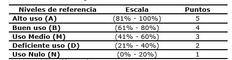 Para obtener la valoración general del uso de las redes sociales por las ECTI, se utilizaron los niveles de referencias de la Tabla 2, los cuales representan el nivel de éxito del uso de una red social, a partir de los indicadores analizados.