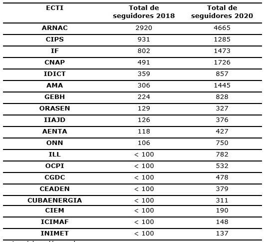En el período analizado, el uso de redes sociales por parte de las ECTI según la muestra se encuentra en incremento. Una de las primeras dificultades detectadas por lo que no se escogió a las 33 ECTI del CITMA, está relacionada con que algunas entidades habían creado perfiles de Facebook, en vez de crear páginas, de ahí que solo se analizaron las entidades que se muestran en la Tabla 1.
