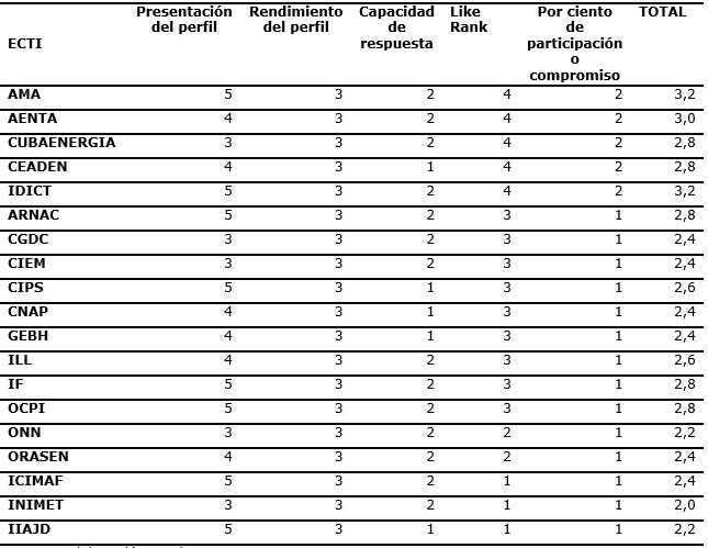 En la Tabla 5 se muestra una valoración general del uso de Facebook por las ECTI, a partir de los niveles de referencia de la tabla, de la cual se excluyó el número de seguidores, pues todos presentan una alta valoración en este indicador y la utilización de los recursos, debido a que está reflejado en el por ciento de participación.