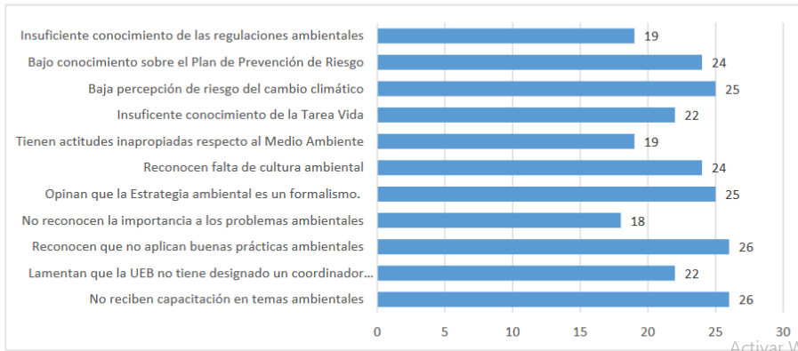 Estos resultados demuestran que aún existe una falta de percepción de riesgo sobre los problemas ambientales y sus impactos en la comunidad de trabajadores de la entidad, que corrobora que aún existen espacios de vacíos sobre el conocimiento y la cultura ambiental. Resultados que coinciden por los reportados por Castro y Suysuy (2020) en trabajos similares en empresas constructoras de Cuba.