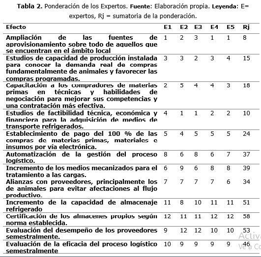 Para realizar una valoración del efecto económico esperado por la implantación de los acciones propuestas al sistema logístico como parte del Sistema de Gestión Integrado de la Empresa Cárnica Pinar del Río, se aplica el procedimiento de Hevia (2008), que parte de la utilización del método de experto participando en el análisis, un total de cinco expertos pertenecientes al Grupo Gestión del Cambio creado en la empresa para el diseño e implementación de los sistemas de gestión.