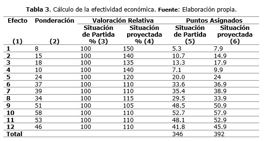Al obtener los valores de importancia otorgado por los expertos se procede a realizar el procedimiento de cálculo del efecto económico, explicándose a continuación (Tabla 3).
