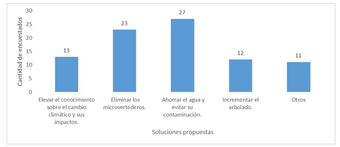 Existe correspondencia entre los problemas ambientales que reconocen los encuestados con las acciones a priorizar para su solución (Figura 3), sin embargo el 37,9 % aluden otros como: mala utilización del agua, falta de áreas verdes, insuficiente saneamiento.