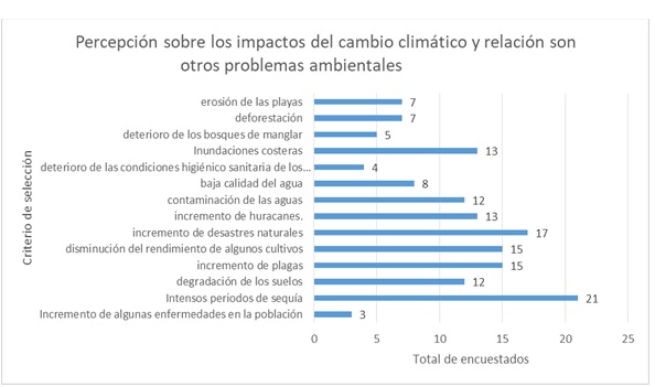 A su vez el 60 % de las personas catalogan estos impactos como graves y el 44,7 % asocian el fenómeno del cambio climático como la razón que da lugar al proceso de relocalización de su comunidad. En general se aprecia en la población estudiada existe una ruptura espacio-temporal de su realidad marcada por dos escenarios de vida diferentes. Según Bayón (2016) en la recopilación de datos del estudio de percepción de riesgo por peligros hidrometeorológicos extremos el municipio de Pinar del Río posee la más baja percepción de riesgo.
