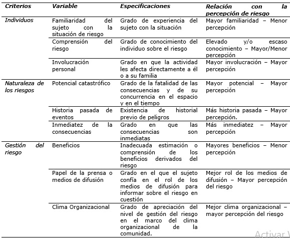 Para el diseño de los instrumentos se tuvo en cuenta los criterios de expertos Carbonell (2013) y Torres (2010) citado en Garea (2014) además, los criterios de especialistas del Grupo Nacional de Evaluación de Riesgos de la Agencia de Medio Ambiente, perteneciente al CITMA. Se estableció la interrelación entre las variables inherentes a: individuo, naturaleza de los riesgos y gestión de los riesgos, con su proporcionalidad respecto a la percepción del riesgo (Tabla).