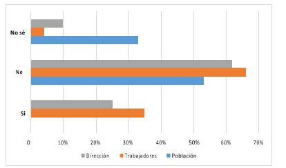 Los resultados de la aplicación de la encuesta según (Figura 1), muestran que en el grupo de trabajadores un 66 % no poseen conocimiento sobre los residuos sólidos y el vertimiento de la cascarilla de arroz, así como el impacto ambiental que este proceso ocasiona; el 62 % del Consejo de dirección tampoco cuentan con conocimiento sobre la situación ambiental y en menor medida la población con un 53 %, que en este caso es la que recibe los efectos negativos del vertimiento de los residuos sólidos de la UEBI.