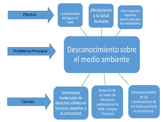 A partir del análisis de los instrumentos utilizados para el diagnóstico del proceso de educación ambiental en la comunidad “El Molino”, se identifican de manera regular ocho problemas ambientales, introducidos y analizados en la matriz de Vester, obteniendo como problema crítico el desconocimiento sobre el medio ambiente, este es el problema que se debe resolver de forma inmediata, hacia donde se deben dirigir los esfuerzos y las estrategias para lograr disminuir los impactos negativos en la comunidad. Para ello se procede a la confección del árbol de problemas (Figura 2), donde queda reflejado el problema principal con las causas y los efectos que provocan a la comunidad de “El Molino”.