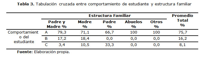 disciplinarias es: el 76 % tiene conducta A, el 16 % posee conducta B y el 8 % obtiene conducta C. La tabla 3, evidencia la tabulación cruzada entre comportamiento de estudiantes y estructura familiar.