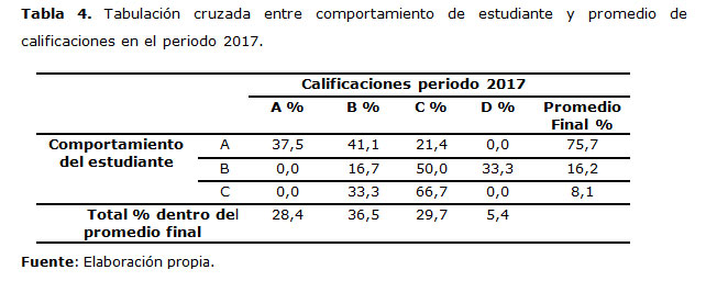 Respecto al promedio curricular final en el periodo en estudio año 2017, los estudiantes que tuvieron evaluaciones de A en un 28,4 %, con notas de B el 36,5 % con nota de C el 29,7 % y con promedios D un 5,4 %. En la tabla 4, se muestra una tabulación cruzada entre el comportamiento y los promedios de calificaciones finales de los estudiantes de la básica superior del colegio ?Los Delfines?.