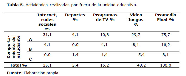 comportamiento de los estudiantes investigados, demostraron la no incidencia en el grupo analizado. Es decir, las prácticas en el uso de internet, redes sociales, deportes videos juegos, ejercidas en un 75,7 % los estudiantes con comportamiento A; en un 16, 2 % los estudiantes cuya conducta es de B y solo un 8,1 % los estudiantes con calificación C en su conducta, tal como se demuestra en la tabulación cruzada de la tabla 5.