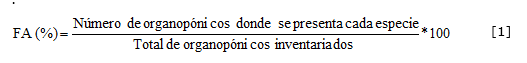 Los datos del inventario de las especies frutales arbóreas, permitieron establecer criterios de dominancia (se describieron la riqueza y abundancia por especie y localidad), así como la frecuencia de aparición (frecuencia absoluta, FA). En esta última se empleó la ecuación [1] descrita en López et al. (2017), ajustada por los autores para las condiciones de estudio