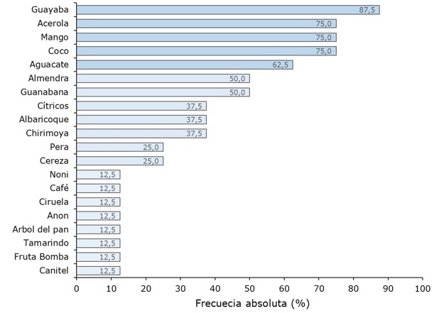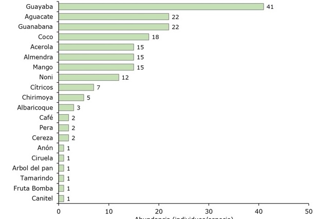 Algunos autores plantean que entre los frutales de mayor importancia económica mundial y nacional se encuentran: cítricos, guayaba, piña, aguacate, papayo, mango, cocotero y otros (Rodríguez et al., 2021), lo que justifica la mayor abundancia de algunas de ellas en las condiciones estudiadas; sin embargo, otras todavía no se aprovechan lo suficiente.