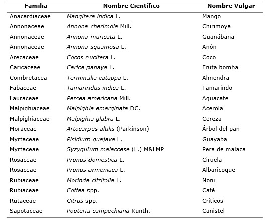 Las especies más abundantes son P. guajava, P. americana, A. muricata, C. nucifera y T. catappa; mientras que, C. nucifera, M. indica, P. guajava, P. americana y M. emarginata presentan mayor frecuencia (≥60 %).