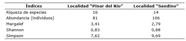 En cuanto a la comparación entre localidades, en número de especies arrojó valores similares, con el 50 % de ellas comunes; sin embargo, la abundancia en “Sandino” excedió 31 % la de Pinar del Río (Tabla 3).