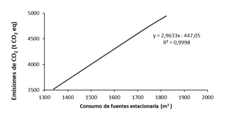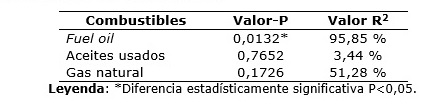 Los resultados de ajustar modelos de regresión lineal simple para describir la relación entre las emisiones de CO2 referidas a las fuentes estacionarias y el consumo de cada uno de los combustibles (aceites usados, fuel oil y gas natural) se indican en la Tabla 5.