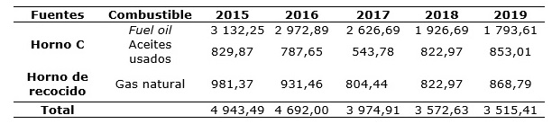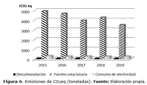 La Figura 6 resume las cantidades de CO2 equivalente emitidas en el período 2015-2019 correspondiente con la descomposición de las materias primas carbonatadas en el horno de fusión, las fuentes estacionarias y el consumo eléctrico asociadas con esta industria.