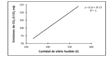La Figura 3 muestra que la cantidad de toneladas de vidrio fundido influye significativamente en las emisiones de CO2; evidenciado en un análisis de regresión lineal. Como es usual en este tipo de producción la cantidad de vidrio fundido es directamente proporcional a las emisiones de CO2 equivalente (Martín, 2013).