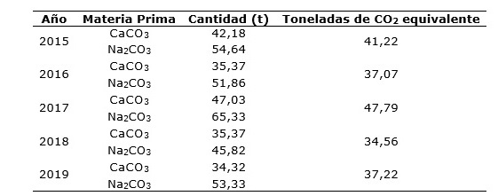 En la industria del vidrio las principales emisiones atmosféricas generadas vienen dadas en la etapa de fusión por el empleo de combustibles fósiles y las materias primas carbonatadas, aunque en los procesos de conformado y recocidos se emiten ciertas cantidades de estos contaminantes (Mari, 2002). Las principales materias primas del vidrio que emiten CO2 durante el proceso de fundición son: la piedra caliza (CaCO3), la dolomita [Ca, Mg(CO3)2] y la ceniza de sosa (Na2CO3) (Equipo Técnico de Gases de Efecto Invernadero, 2018). Estos materiales, allí donde se extraen como carbonatos minerales para ser utilizados en la industria del vidrio, representan una producción primaria de CO2 y deben incluirse en las estimaciones de emisiones (Vinos, 1988).