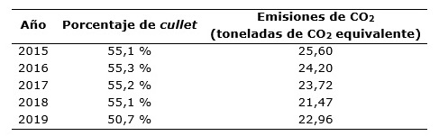 En la Tabla 2 se expone el porcentaje de cullet para la producción de vidrio determinado mediante el empleo de nivel 2, a partir del consumo de materia prima y las toneladas de vidrio roto, así como las emisiones de CO2 equivalente, correspondiente a cada año.