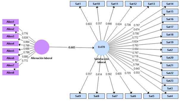 Posteriormente, es necesario mencionar que el coeficiente de determinación R² indica la proporción de varianza explicada por el constructo exógeno en cada uno de los constructos endógenos ( Levy, Varela y Abad, 2006). El modelo estructural de la presente investigación fue evaluado con los criterios de R² en variables endógenas, considerando una R² de 0.67 como sustancial; una R² de 0.33 como moderada y una R² de 0.19 considerada débil (Henseler et al, 2009). La R² obtenida como resultado fue de 0.470 (moderada), lo que significa que la variable de alienación laboral explica el 47% de la varianza del constructo de satisfacción laboral. Por lo que se concluye que la alienación laboral se caracteriza por ser una variable predictora al relacionarse negativa, estadística y significativamente con la satisfacción laboral, brindando el soporte necesario para no rechazar la hipótesis planteada en este estudio [ Figura 1].