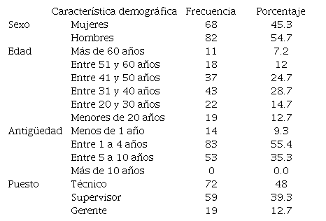 Las características demográficas de los participantes se presentan en la Tabla 01. Con base en los resultados obtenidos, dentro del apartado del sexo de los participantes, de las 150 que participaron, el 45.3% son mujeres y el 54.7% son hombres. El segundo apartado es el de la edad, en donde los participantes menores de 20 años conforman un 12.7% del total de la muestra, los que se encuentran entre los rangos de 20 a 50 años representan un 68.1% y aquellos participantes pertenecientes al rango de mayores de 50 años se identifica un 19.2% del total de los participantes. Con respecto al apartado de la antigüedad laboral, se puede observar que un 9.3% de los participantes tiene menos de 1 año trabajando para la organización, un 55.4% refiere tener entre 1 y 4 años de antigüedad y un 35.3% reporta más de 5 años de trabajo en la organización respectiva. En lo referente al apartado de los puestos, destacan el de técnico con un 48%, el de supervisor con un 39.3% y el de gerente con un 12.7%.