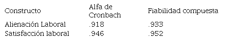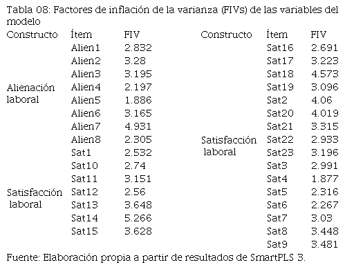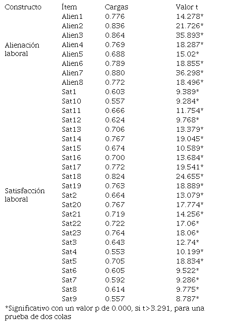 Acorde al contenido de la Tabla anterior, los valores t de los ítems que conforman los diferentes constructos se encuentran en un rango de 8.787 [Sat9] a 36.298 [Alien7], es decir, todas las cargas resultaron significativas estadísticamente, evidenciando valores t superiores a 3.291.