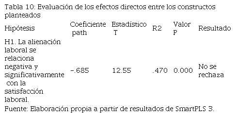 Con base en el contenido de la Tabla anterior, es posible apreciar una fuerte relación entre la alienación laboral con la variable latente de satisfacción laboral, ya que se obtuvo un coeficiente path de -.685. Se debe recalcar que, dada la estandarización, los coeficientes path pueden variar de -1 a +1, por lo que los pesos más cercanos al 1 absoluto, independientemente del signo algebraico, reflejan los caminos más fuertes ( Garson, 2016). Adicionalmente, dicho coeficiente se caracteriza por ser estadísticamente significativo por su valor t (t=12.55 con un valor p de 0.000), ya que es mayor al valor de 1.96 recomendado en la evidencia científica ( Cohen, 1992). En lo que se refiere al signo algebraico del coeficiente path, éste coincide con el signo asignado a priori, lo que provee una validación empírica parcial de la relación teórica asumida entre las variables latentes ( Henseler et al., 2009).
