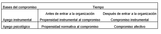 El modelo de dos dimensiones fue desarrollado por Cohen, (2007) partiendo de la premisa que los empleados llegan a una organización con ciertas actitudes de compromiso y se establece una temporalidad: antes y después de entrar a la organización. Además, de acuerdo con su teoría, el modelo se compone por las dimensiones de apego instrumental y psicológico, las cuales pueden observarse en la figura 1.